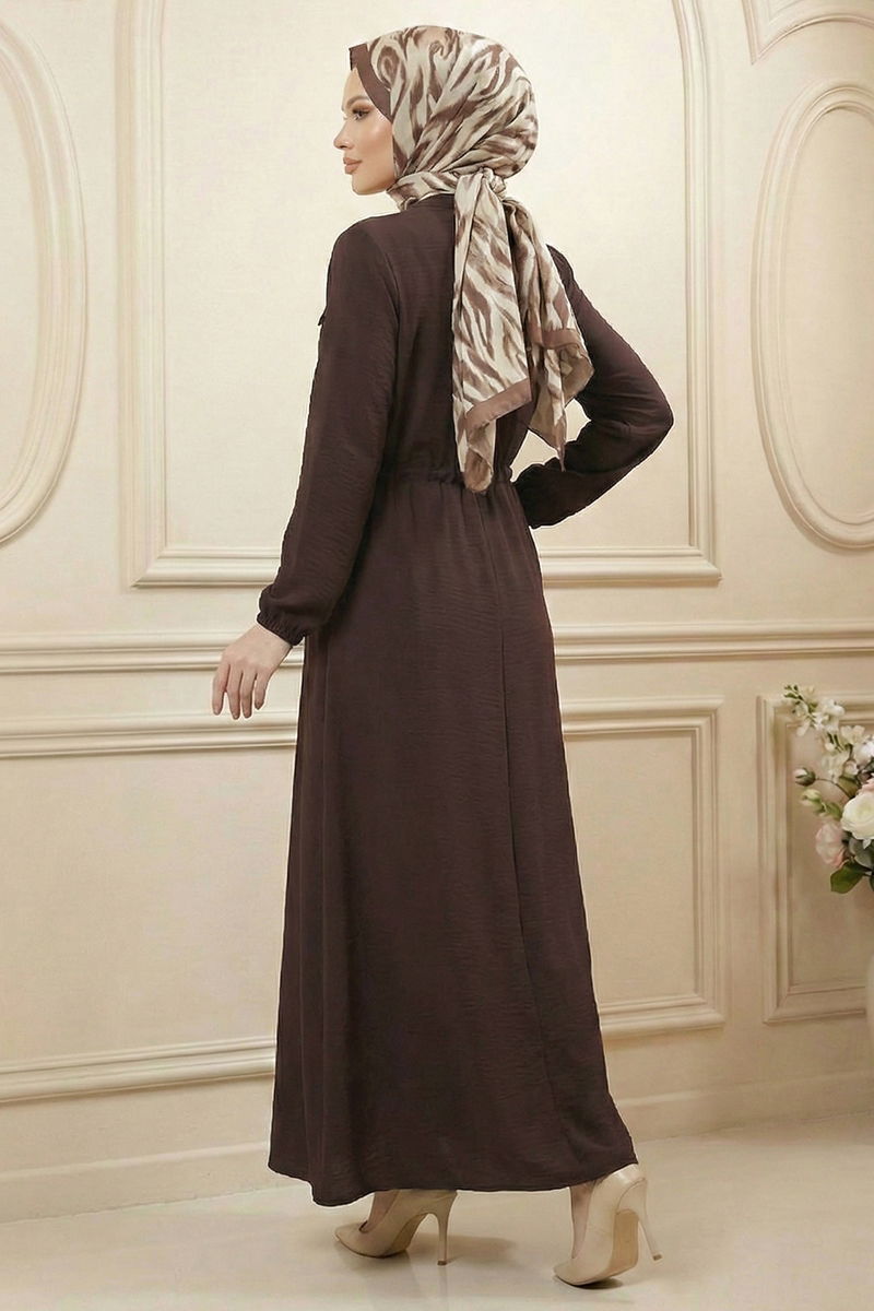 Şık ve modern tasarımıyla dikkat çeken Kahverengi Taş Detaylı Aerobin Elbise, tesettür koleksiyonunuzun yıldız parçalarından biri olabilir. Aerobin kumaşı sayesinde her mevsim kullanabileceğiniz bu elbise, gün boyu rahatlık sunar. Hakim yakası ve önü düğmeli tasarımıyla kullanışlıdır. Astarlı olmayan yapısı ve esnek kol manşetleri ile konfor sunar, bel bağı ile estetik bir görünüm sağlar. 30 derecede yapılan hassas yıkama ile uzun süre yeni gibi kalır.
