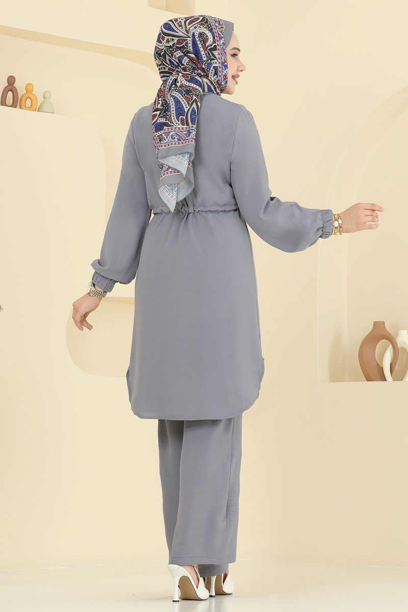 Product Feature : It is a new season hijab fashion product. It has a laced waist. The product has a Shirt collar. The product has From the front buttons. The tunic has a side slash.. Unlined. The stones are glued. The waist of the trousers is elastic. The cuff is rubberized. There may be a tonal difference in the product due to concept photo shoots.