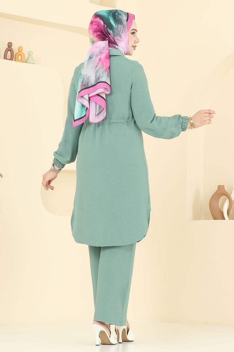 Product Feature : It is a new season hijab fashion product. It has a laced waist. The product has a Shirt collar. The product has From the front buttons. The tunic has a side slash.. Unlined. The stones are glued. The waist of the trousers is elastic. The cuff is rubberized. There may be a tonal difference in the product due to concept photo shoots.