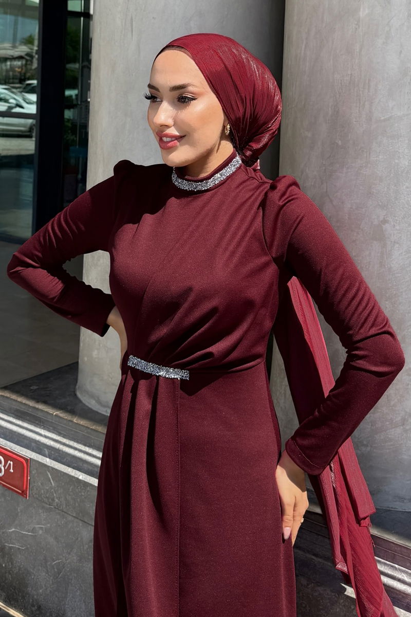 Taş Detaylı Krep Abiye 4645ALG474-MS Bordo