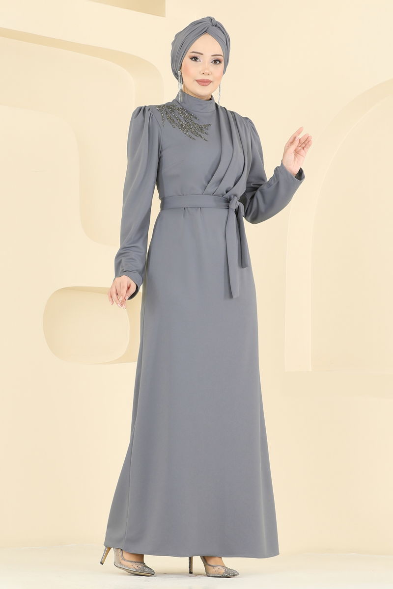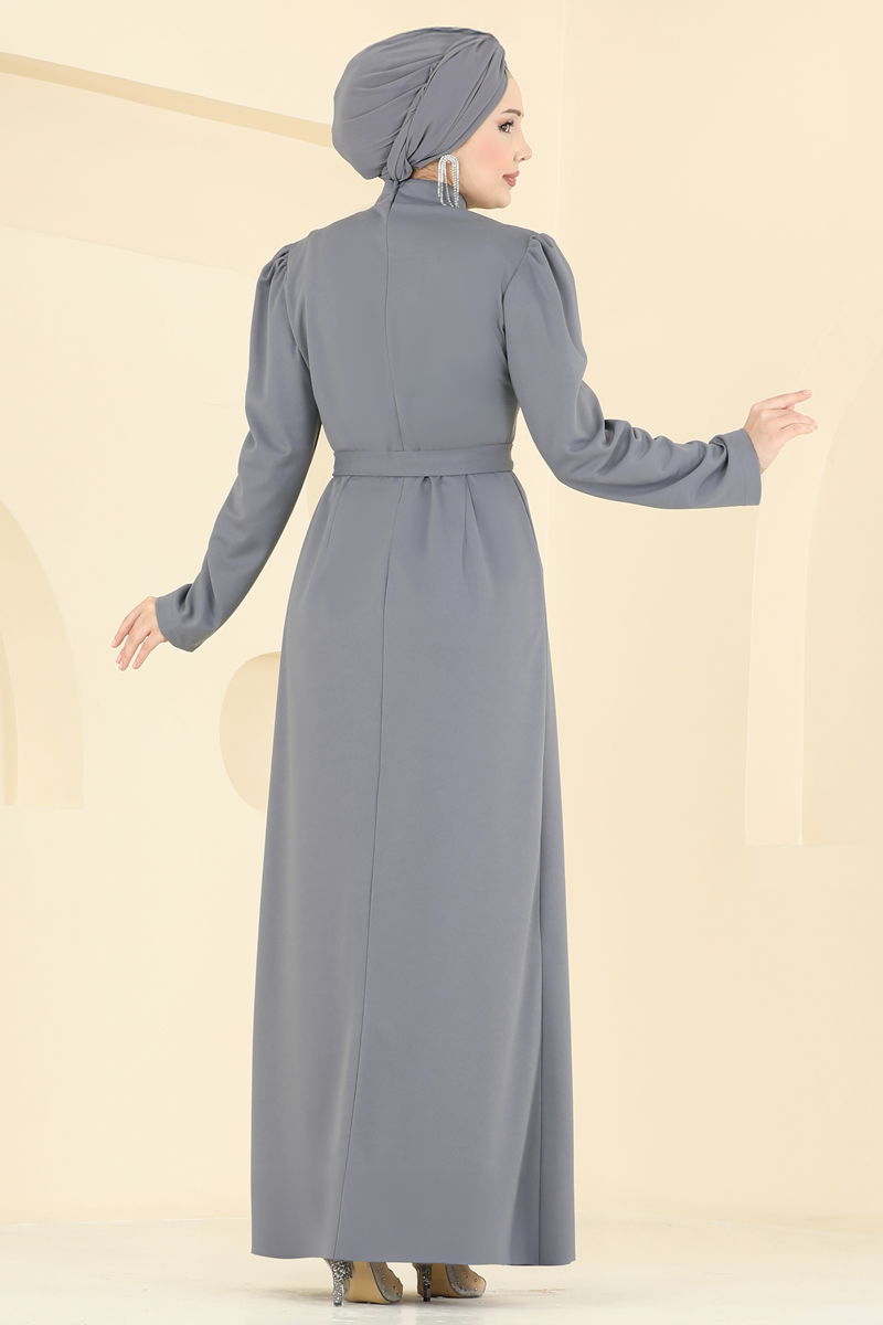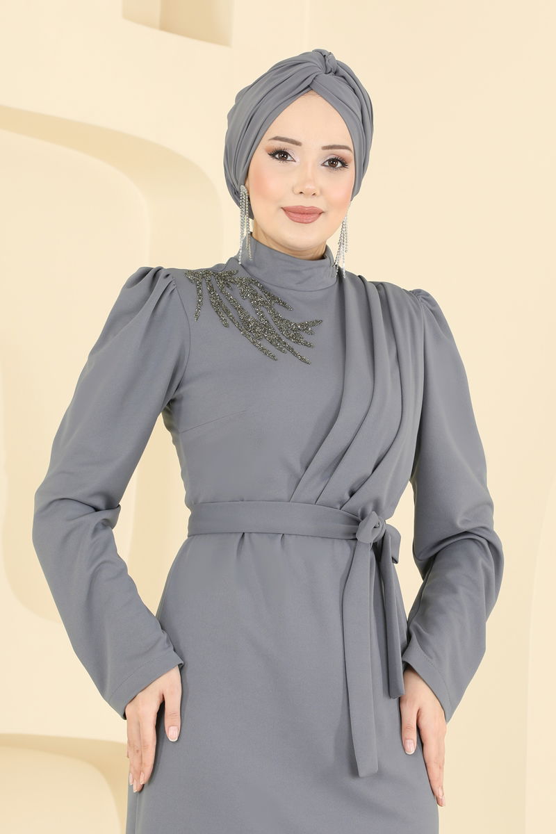 Taş Detaylı Krep Elbise 0846LVA1173-MS Gri