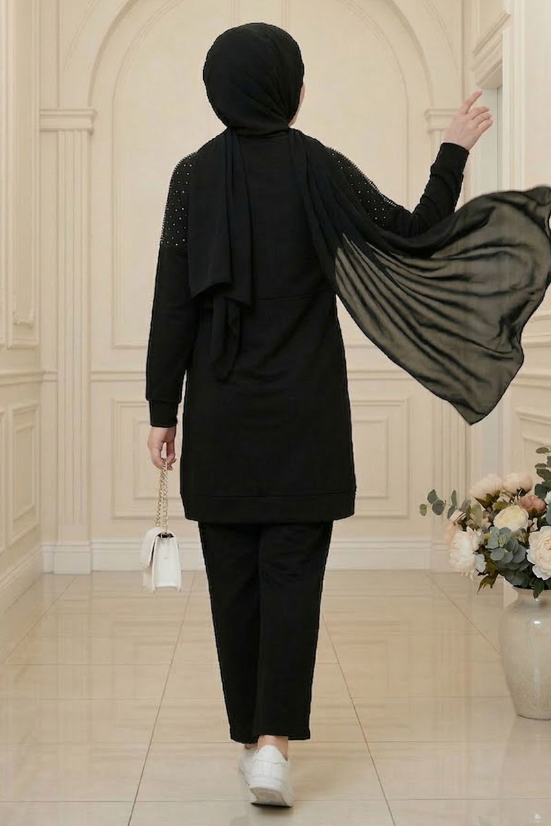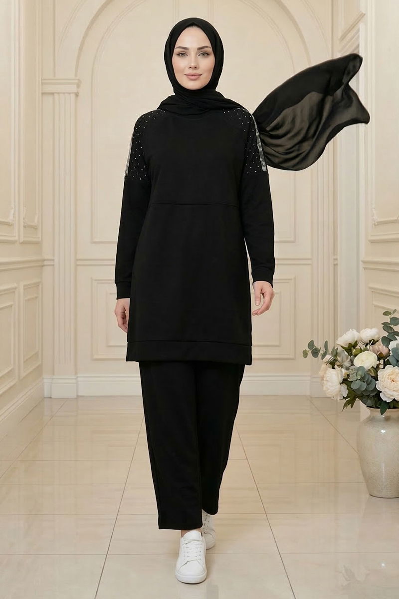 Modal Kumaşlı Siyah Takım Detaylı Taşlarla Süslenmiş