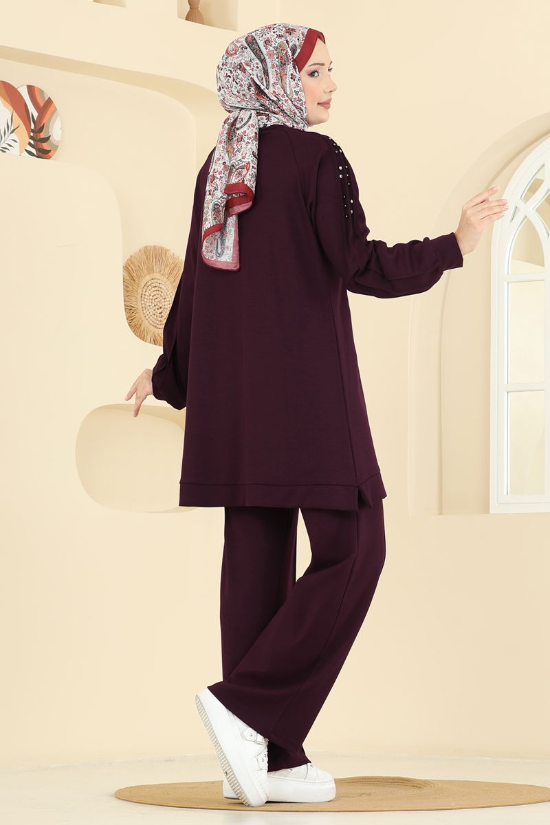 The Stone Detailed Modal Suit offers elegance and comfort together, providing a sophisticated option for modest wear. Suitable for all seasons, this suit dazzles with its striking stone details. Enjoy the soft touch of modal fabric with the design that facilitates easy washing and ironing. Consisting of a tunic and trousers, this set offers all-day comfort thanks to its elastic waist. It features a crew neck and is unlined for a contemporary look. The product is displayed in size S on the model.