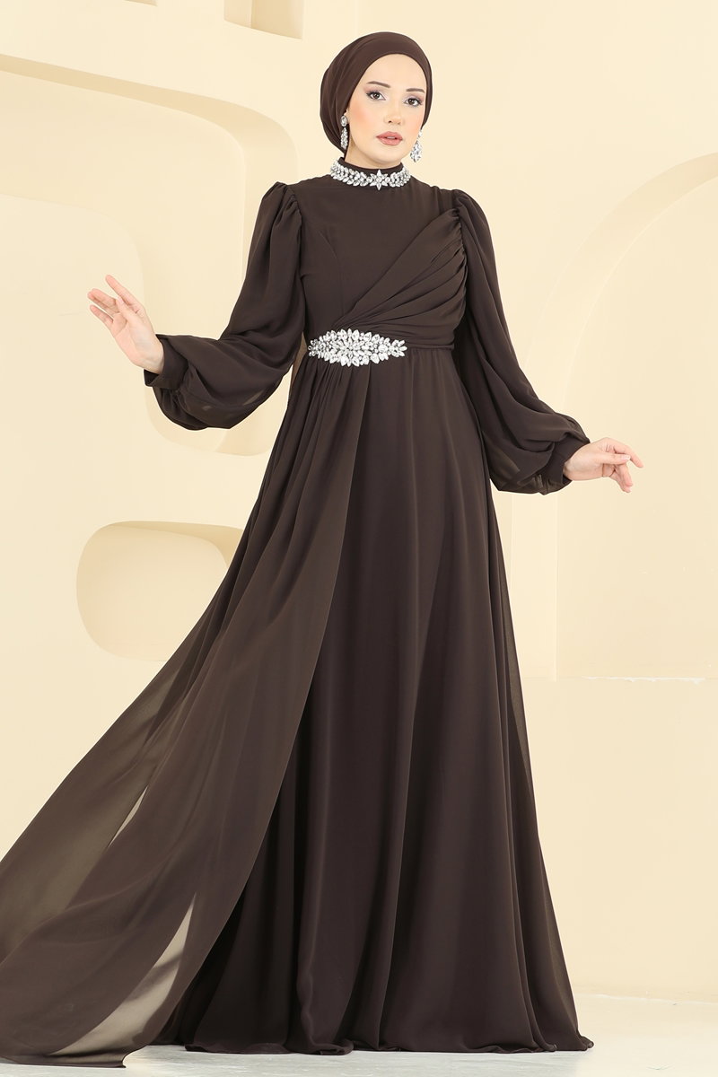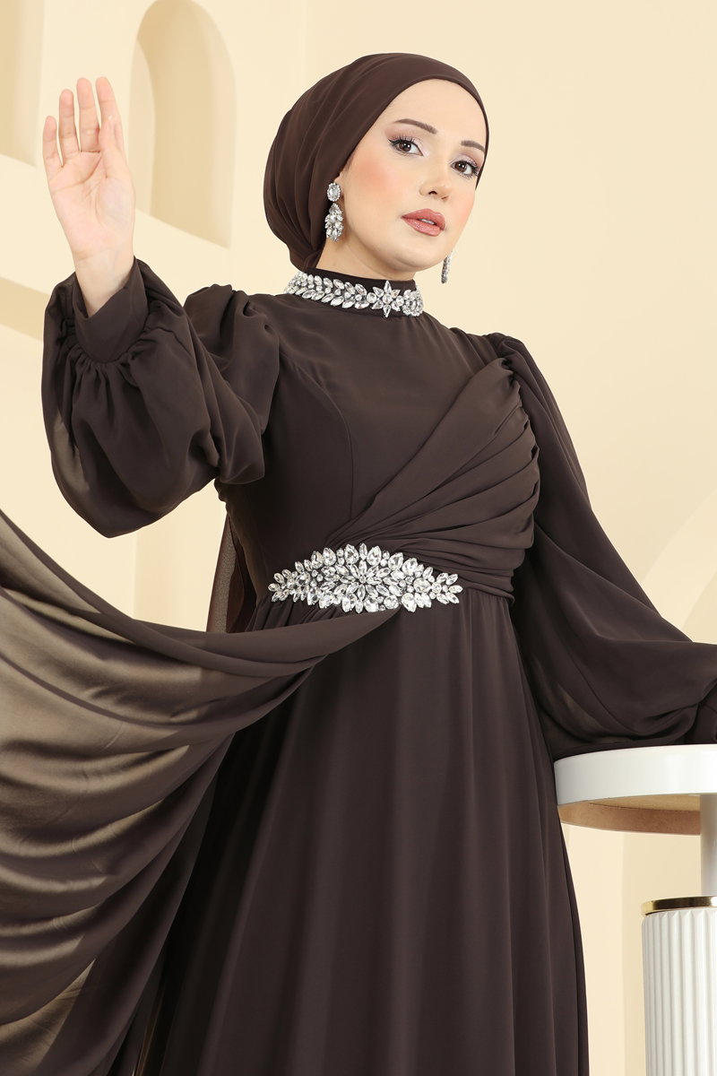 Taş Detaylı Şifon Abiye 6999YG95-MS Kahve