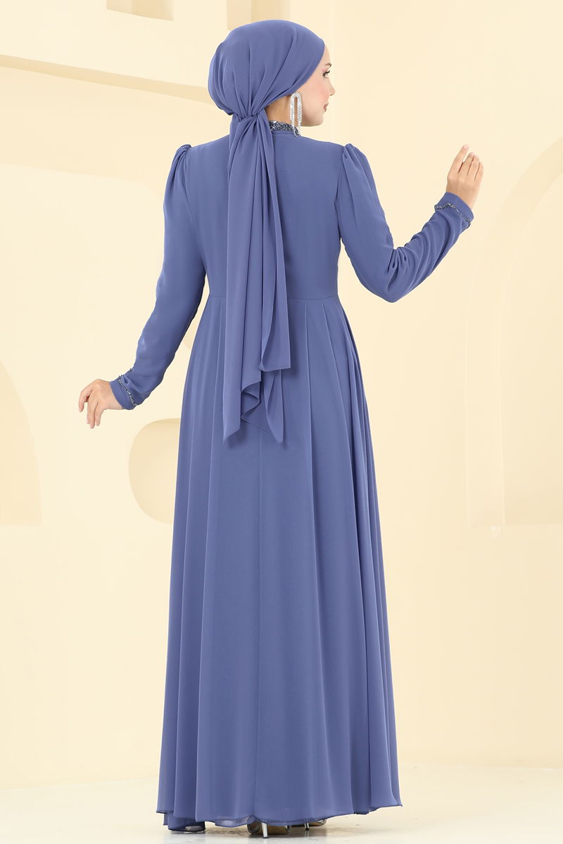 Taş Detaylı Şifon Abiye 8019AB368-MS Mavi