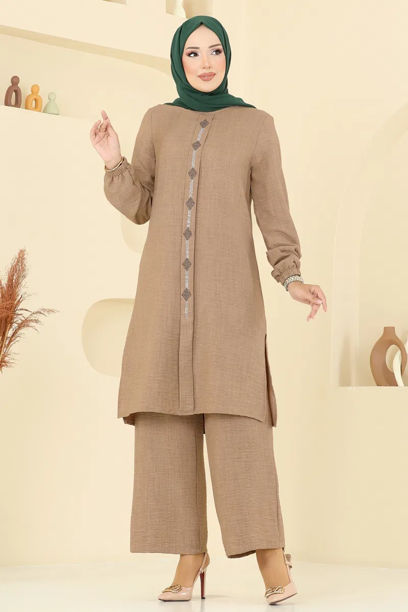 Sofia Set KOMBİN; taş detayları ve özgün tasarımıyla her mevsim giyilebilir. Sofia keten kumaşı tercih edilerek üretilmiştir ve sıkılmadan 30 derecede yıkanabilir. Tunik yanlardan yırtmaçlı ve bisiklet yakalı bir yapıda olup, astarsızdır. Pantolon ise kullanım kolaylığı için elastik bel ve manşetlere sahiptir. Tunik, pratik kullanım için arka kısmında düğme detayına sahiptir, taş detaylar yapıştırma yöntemiyle eklenmiştir. Her durum için ideal olan bu şık ve fonksiyonel tesettür kombine, tarzınızı ön planda tutar.