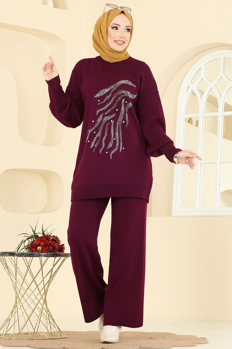 This elegant Stone-Embellished Knitwear Set is the perfect modest ensemble for your autumn and winter. Made from soft knit fabric, it can be gently washed at 30 degrees to maintain its quality. The crew neck and unlined design offer comfortable wear, while the affixed crystals on the tunic enhance your sparkle. The elastic waistband on the pants ensures comfort. Available in standard sizing, this set combines elegance with ease.