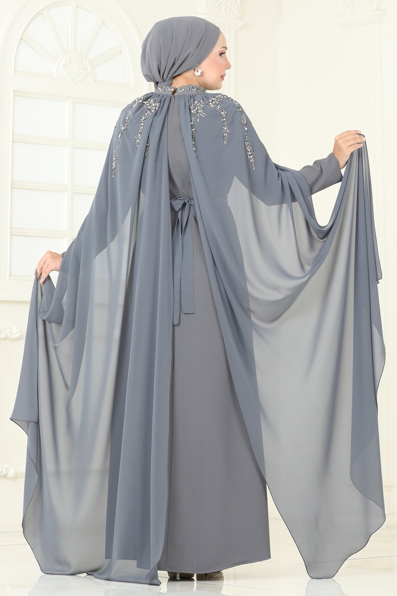Taşlı Pelerinli Şifon Abiye 8073AB368-MS Koyu Gri