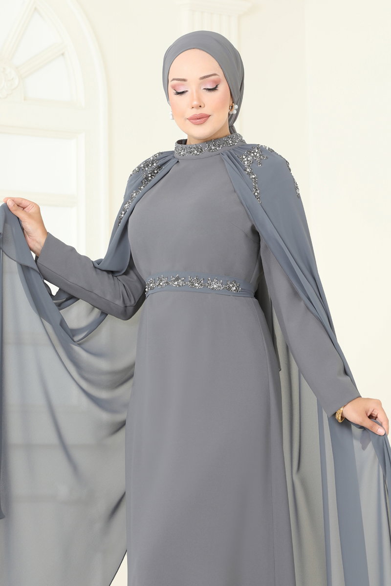 Taş Detaylı, Koyu Gri, Şifon Pelerinli Abiye Elbise