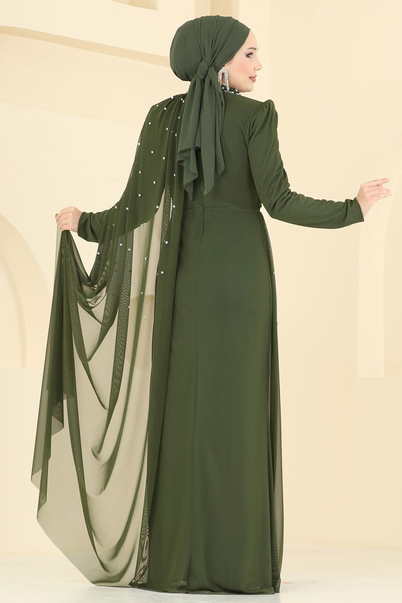 Taşlı Pelerinli Tül Abiye 5736EDF311-MS Haki