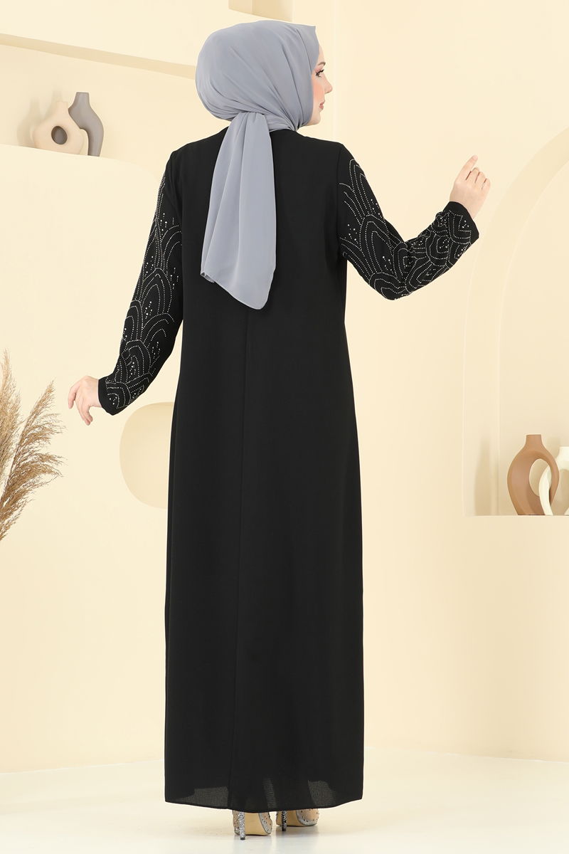 Elegantly complete your modest fashion with this Stone Beaded Honeycomb Fabric Evening Dress. Perfect for all seasons, this dress will make you shine on your special occasions. Featuring a bicycle neckline and a zipper at the back, this model offers a modern touch, while its lining-free design ensures a light and comfortable fit. The stones are adhesive and the cardigan is sewn into the dress. This special item, which should be cleaned by dry cleaning only, will hold a special place in your wardrobe.