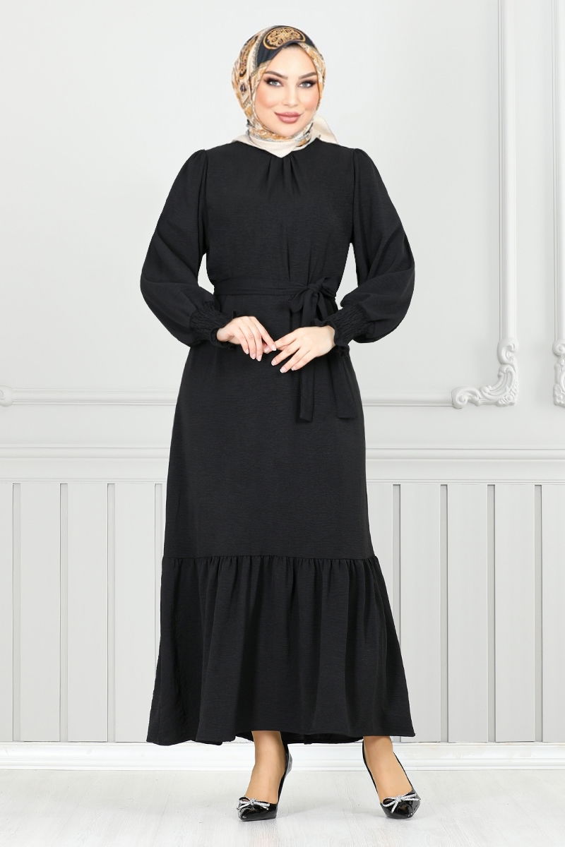 Aerobin Dress with Elastic Cuff is Black Fabric Feature: It is made of aerobin fabric. It can be used in Four Seasonal seasons. Product Feature: New season hijab is a fashion product. The product is the dominant collar. It is unlined. The product is zipped from the back. The belt is included in the product, it may not be used on request. The cuff is rubberized.There may be a tonal difference in the product due to concept photo shoots. Washing : IT CAN BE WASHED WITHOUT TIGHTENING AT 30 DEGREES.(DELICATE WASHING) Belt Feature: The two ends of the belt are sewn so that it does not fluctuate, the middle part is left empty (seamless). (The item on the model is size 38.) Aerobin Dress with Elastic Cuff is a hijab model that you can use easily in all seasons. suitable for sensitive washing at 30 degrees, this dress is made of breathable aerobin fabric. It offers a modern and stylish look with its dominant collar and back zipper design. It is light and comfortable thanks to its unlined structure. The cuff of the dress is rubberized and provides a fully fitting structure. The belt is designed with both ends sewn together to prevent rippling and is presented as a compatible complement to the dress; it may not be used optionally.Weight (Kg):0.56