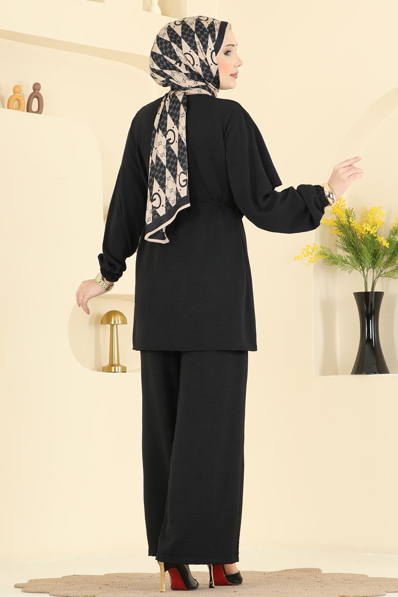 Siyah Toka Aksesuarlı Aerobin Takım, dört mevsim kullanıma uygun olup aerobin kumaş kullanılarak üretilmiştir. 30 derecede hassas yıkama ile temizlenebilen bu ürün, bisiklet yaka detayı ve sırttan düğme kapatmalı tasarımıyla dikkat çeker. Astarsız yapısı ve sabitlenmiş toka aksesuarı ile şık bir görünüm sunar. Modelin üzerindeki beden 38’dir.