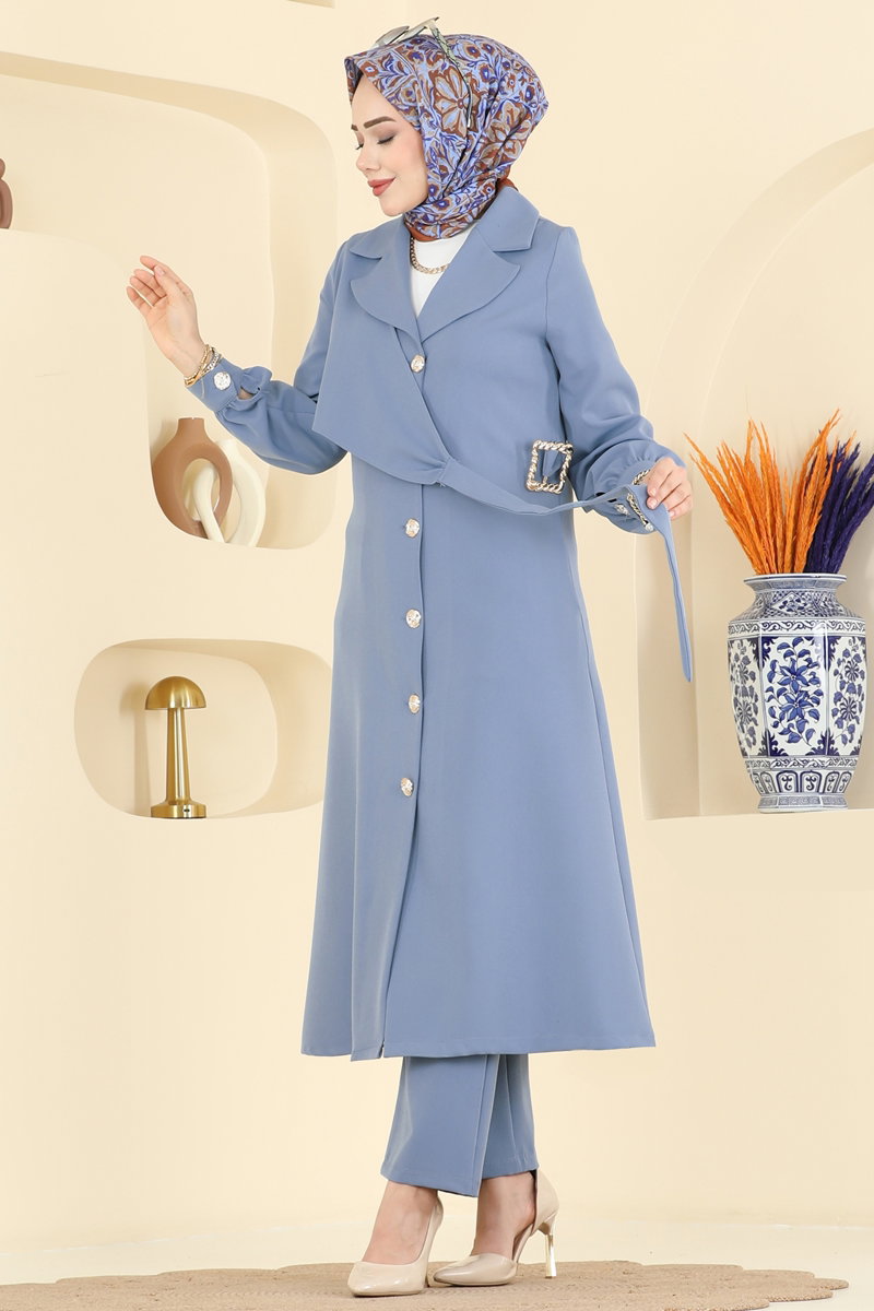 Ürün Özellikleri : Tesettür giyim için yeni sezona özel tasarım. Gizli cepler bulunmaktadır. Ceket tipi yaka tasarımına sahiptir. Ön kısmı düğmeli yapıdadır. Astarı bulunmamaktadır. Üst parça ve toka detayı monte edilmiştir. Pantolon beli lastiklidir. Manşet düğmeleri işlevseldir.Fotoğraf çekimlerinden ötürü renk farklılıkları meydana gelebilir.