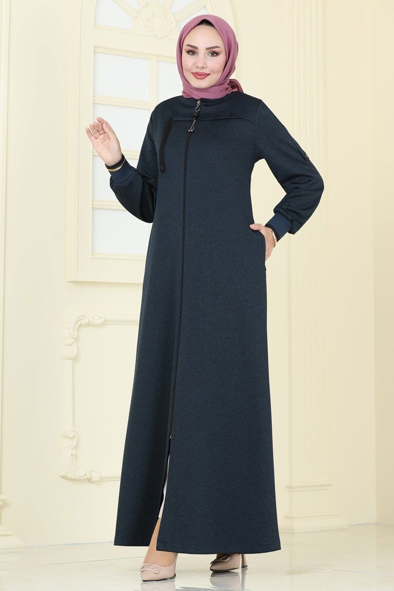 Front Zippered Hijab Coat model hijab product. It can be used in Autumn and Winter season. It should be washed at 30 degrees without squeezing. Made of first-class Shantung fabric. The product has a bicycle collar. It's unlined. The product is front zippered. (The product on the model is size 38.) Height: 160 cm, Chest: 86 cm, Waist: 68 cm, Hip: 95 cm, Weight: 52 kg. Snap details are accessory.