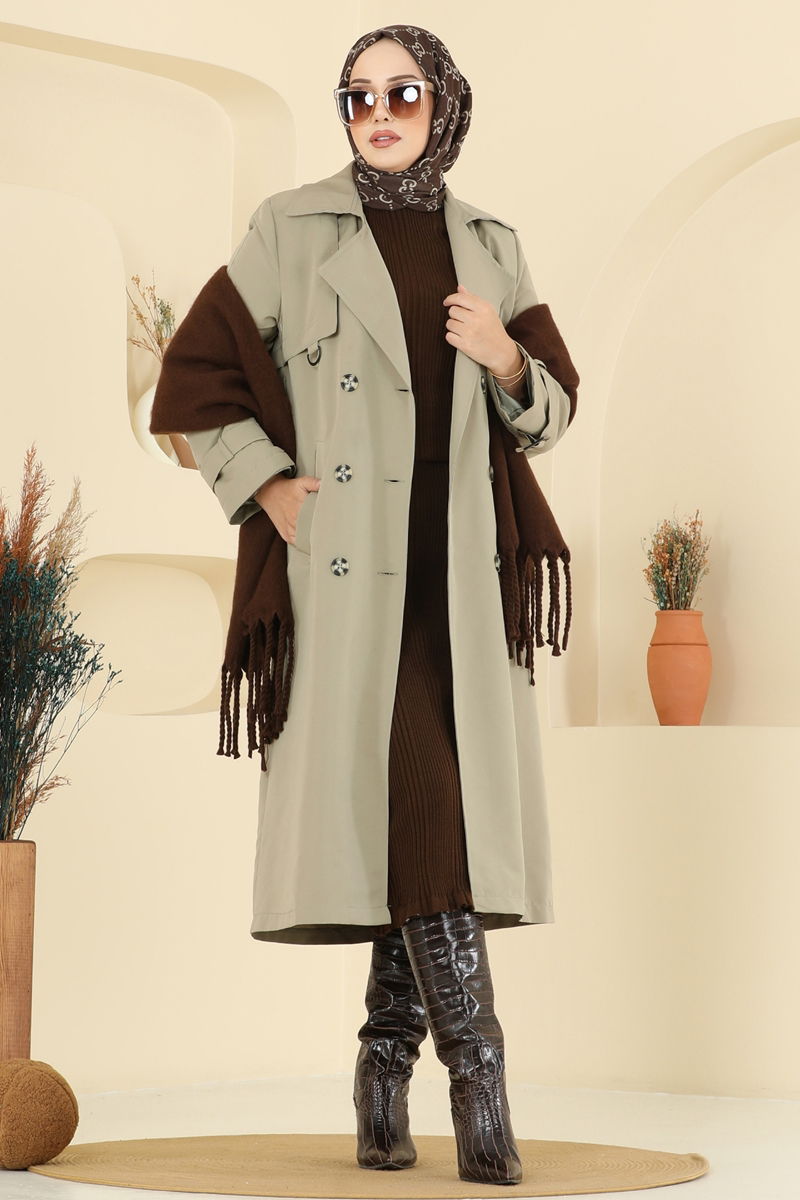 Product Feature : It is a new season hijab fashion product. The product has a Double-breasted collar. The product has From the front buttons. Slach buttons are an accessory.. It is lined. Belt included, optional not available. Pocket available. There may be a tonal difference in the product due to concept photo shoots.