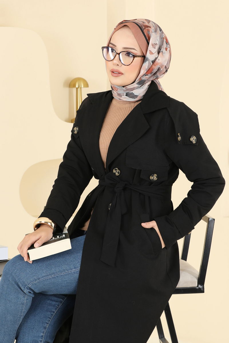 The Cuff Accessory Buttoned Trench Coat, suitable for hijab fashion, is an essential item for autumn and winter seasons. This trench coat, which can be washed delicately at 30 degrees, is made from high-quality Amazon fabric. It features a semi-buttoned front and a lined interior, offering both elegance and comfort. Available in size 38, this product also includes pockets for practical use, while the stylish buttons on the cuffs add a modern touch to the design.