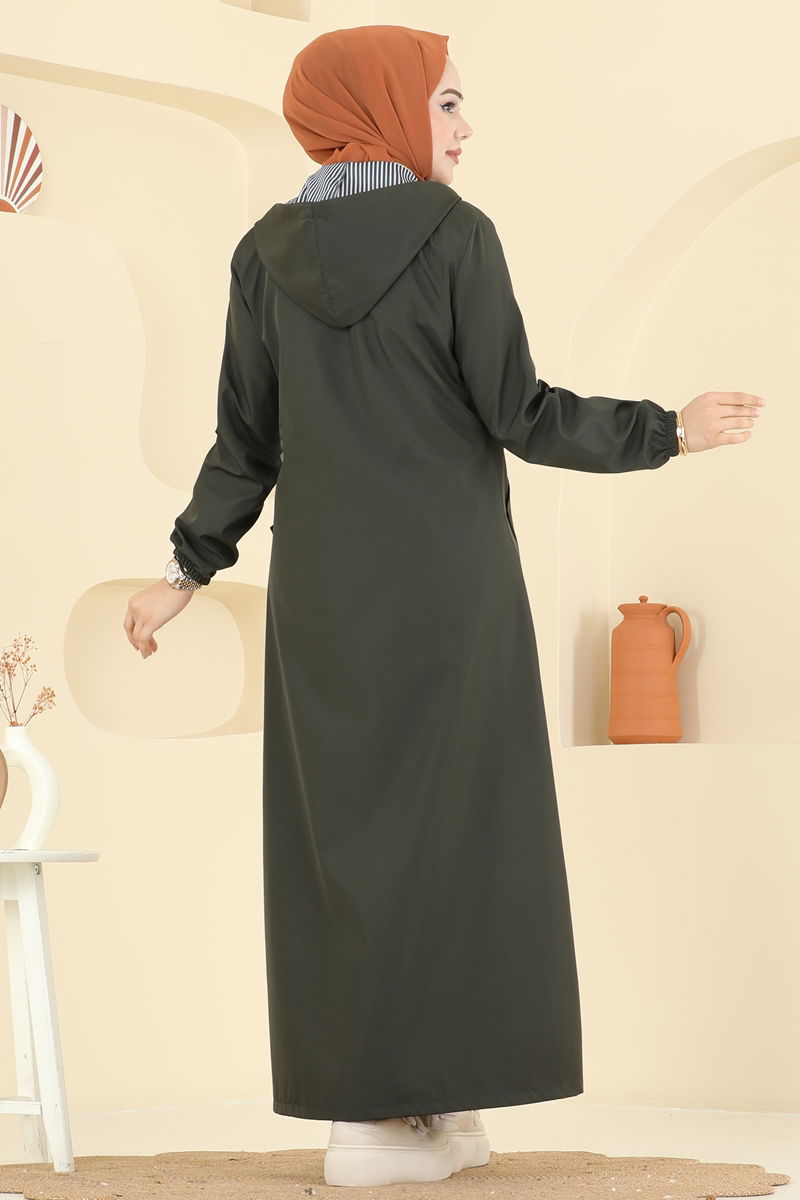 This trench coat, ideal for autumn and winter, is designed in accordance with the modest fashion style. Its front-zipper and hooded design provide ease of use in cold weather. The ability to wash it gently at 30 degrees makes it perfect for long-term use. Made from bondit fabric, it is unlined and has elastic cuffs. Its practical pocket design is perfect for carrying your necessities with you in daily use. Achieve an elegant look with the 38-size model showcased.