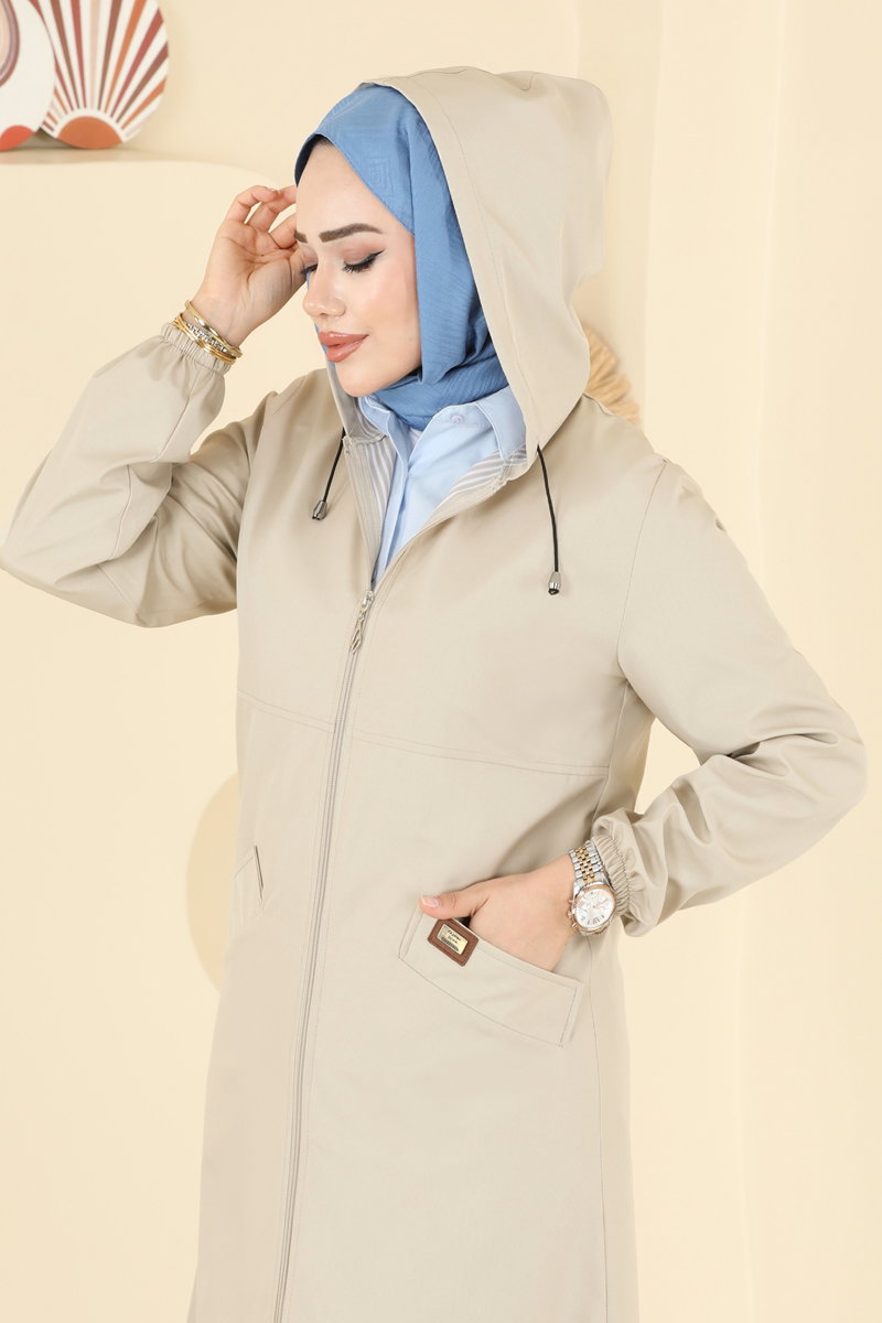 This trench coat, ideal for autumn and winter, is designed in accordance with the modest fashion style. Its front-zipper and hooded design provide ease of use in cold weather. The ability to wash it gently at 30 degrees makes it perfect for long-term use. Made from bondit fabric, it is unlined and has elastic cuffs. Its practical pocket design is perfect for carrying your necessities with you in daily use. Achieve an elegant look with the 38-size model showcased.