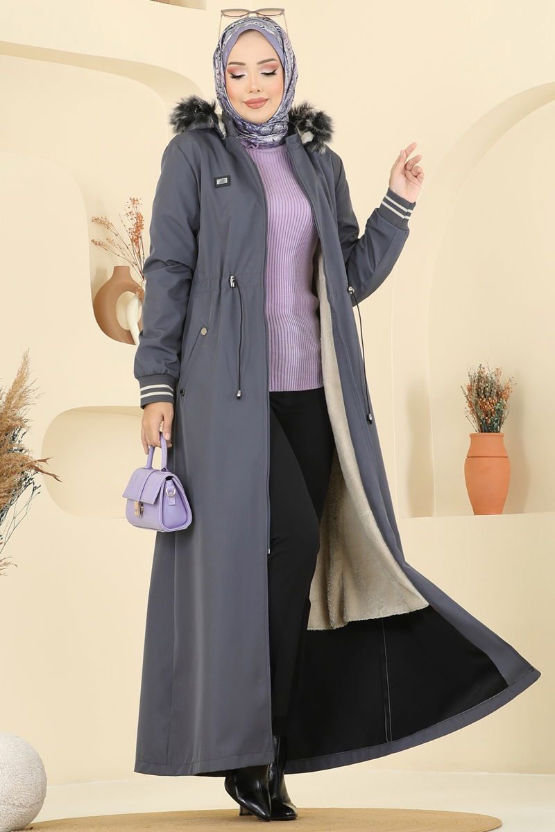 The Fur Detailed Arm Badge TRENCHCOAT is specially designed for those who love modest fashion, providing elegance during the fall and winter seasons. This coat, which should be cleaned only by dry cleaning, is made from bonded and fur fabric and has a fur-lined interior. The product is zippered in the front and comes with a detachable hood according to preference. It also features pockets for practical use. The product displayed on the model is size 38.