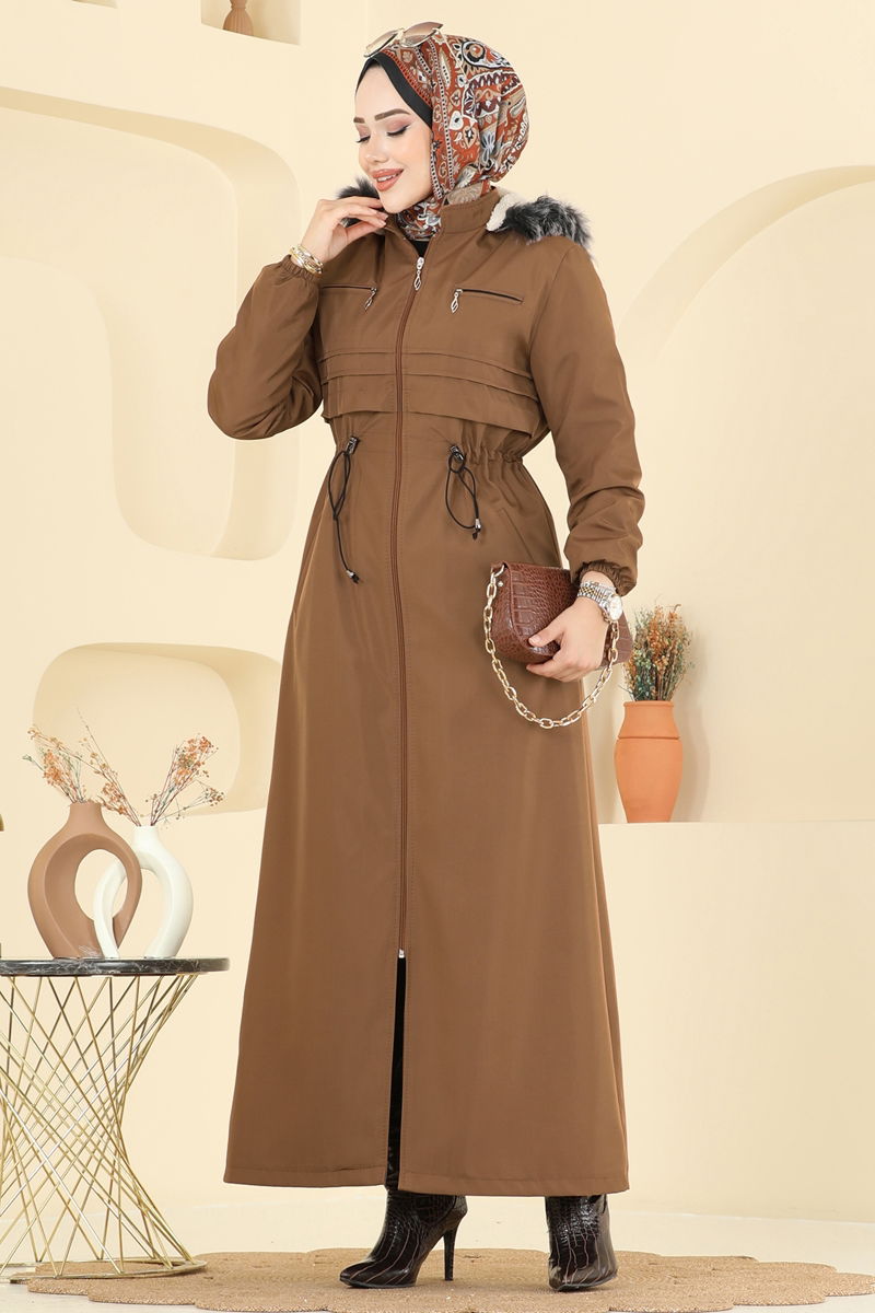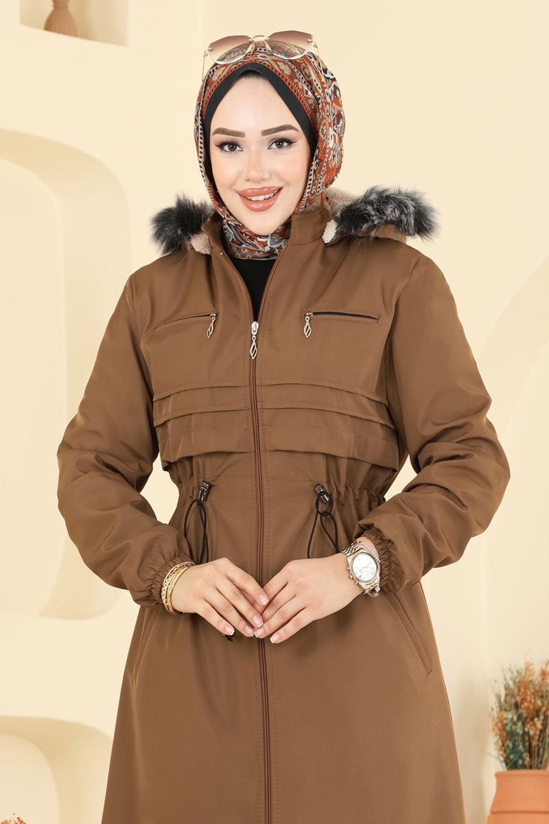 Product Feature : It is a new season hijab fashion product. The hood is detachable and can be used optionally. It has a laced waist. The product has a Upright collar. The lining is made of fur.. The product has a zipper at the From the front part. The fur is sewn into the product. Zipper detail is an accessory. The product has a pocket. The cuff is rubberized. There may be a tonal difference in the product due to concept photo shoots.