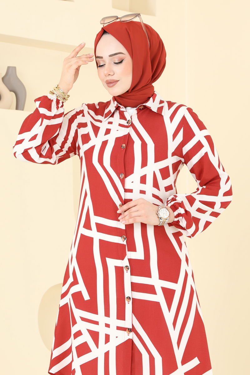 The Geometric Pattern Tunic is a perfect choice for modest wear. It can be comfortably worn in spring and summer. Hand wash is recommended. Made of first-class viscose fabric. It has a shirt collar and buttoned front. Unlined. (The product on the model is size 38.) The cuffs are elasticated.