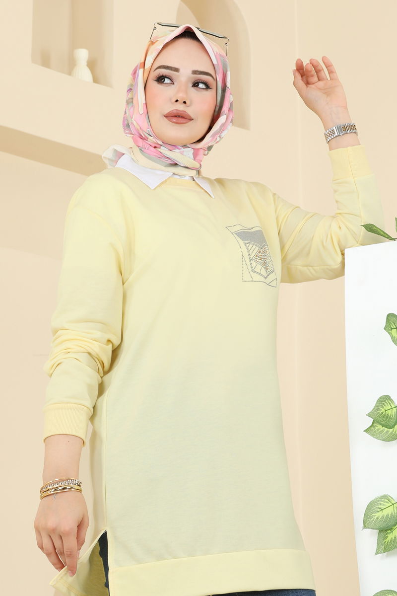 Combining elegance and comfort, the Accessory Pocket Embroidered Tunic is a hijab product that can be comfortably used in all seasons. Featuring a distinctive design, this tunic can be cleaned at 30 degrees with delicate washing. It is made from double-thread fabric and has a crew neck which adds a modern look. The stone details add a stylish touch to the design. The product shown on the model is size M and is unlined.