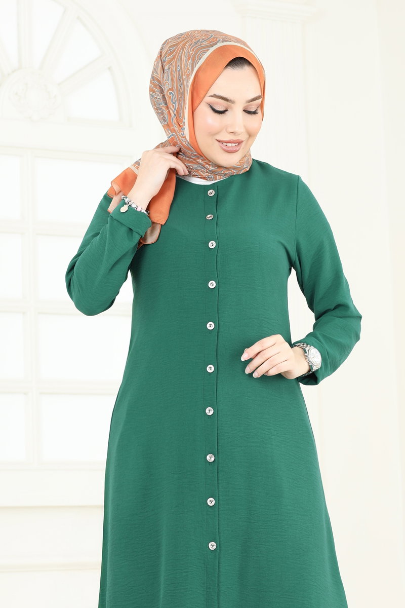 Front Buttoned Hijab Tunic is crafted from aerobin fabric, suitable for all-season use. It can be washed at 30 degrees on a gentle cycle. Stylish and convenient, this tunic features front buttons and is unlined. It has a crew neck and offers a modern look. The size 38 on the model provides an option that suits everyone's taste.