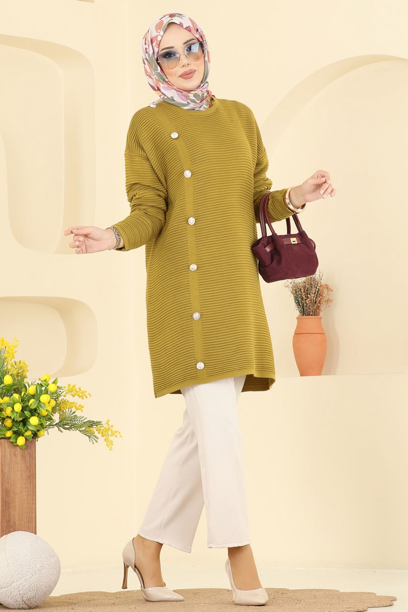 The Accessorized Buttoned Knit Tunic is a modest wear piece perfect for autumn and winter, offering both style and comfort. This garment can be washed gently at 30 degrees and is made from knit fabric. It features a crew neck and is unlined for added comfort. The buttons on the tunic serve as stylish accessories only.
