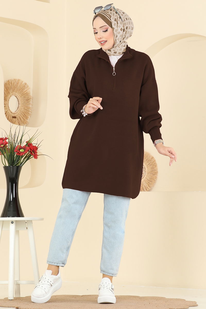 The Balloon Sleeve Knit Tunic offers both comfort and elegance for the autumn and winter seasons, marking a new trend in modest fashion. Washable at 30 degrees due to its delicate nature, this garment combines the warmth and comfort of knit fabric with your skin. Its straight collar and lining-free design emphasize minimalism, while the half-zip front adds practicality. With its balloon sleeves, this tunic provides a contemporary look, fitting all body types with its standard size.