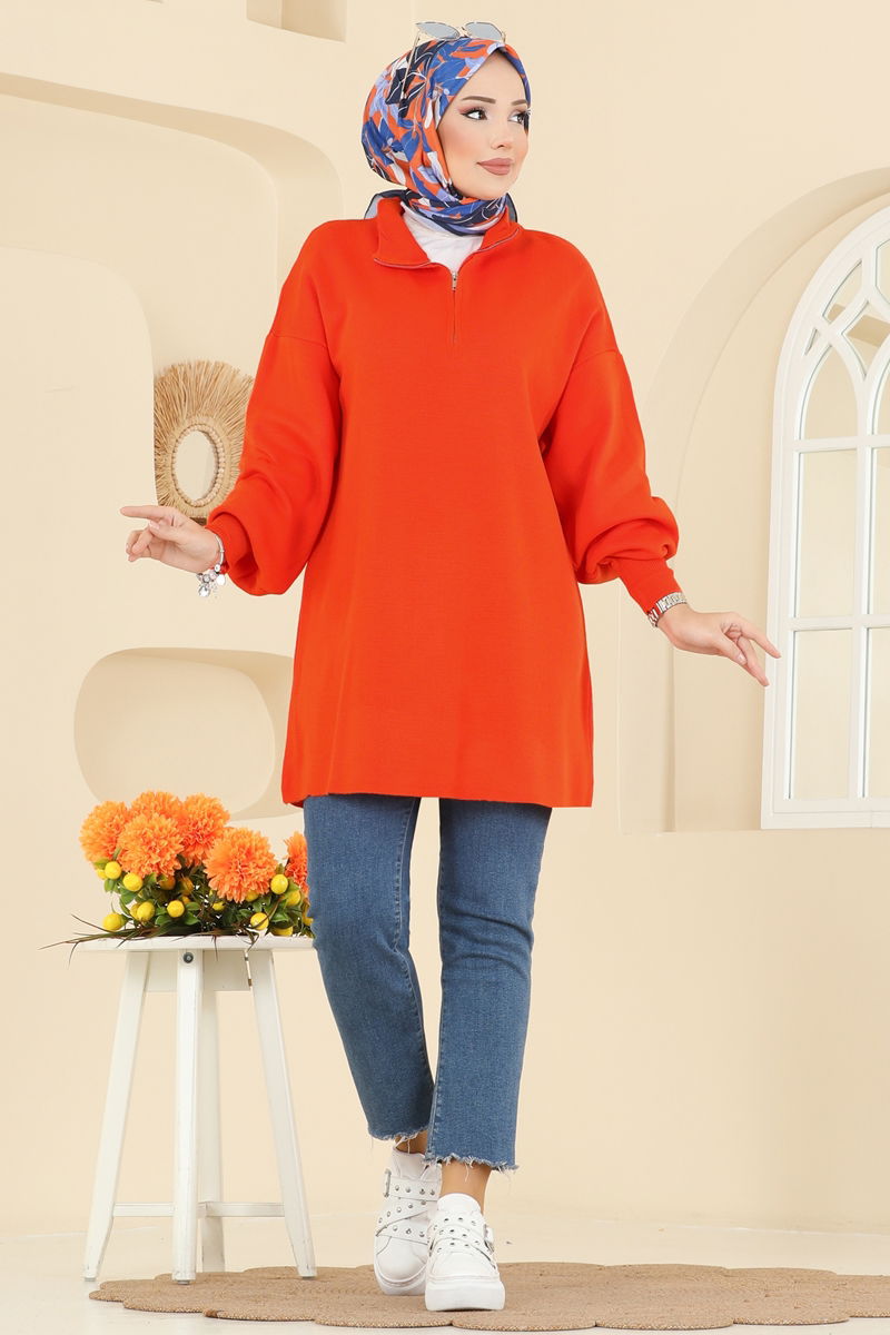 The Balloon Sleeve Knit Tunic offers both comfort and elegance for the autumn and winter seasons, marking a new trend in modest fashion. Washable at 30 degrees due to its delicate nature, this garment combines the warmth and comfort of knit fabric with your skin. Its straight collar and lining-free design emphasize minimalism, while the half-zip front adds practicality. With its balloon sleeves, this tunic provides a contemporary look, fitting all body types with its standard size.