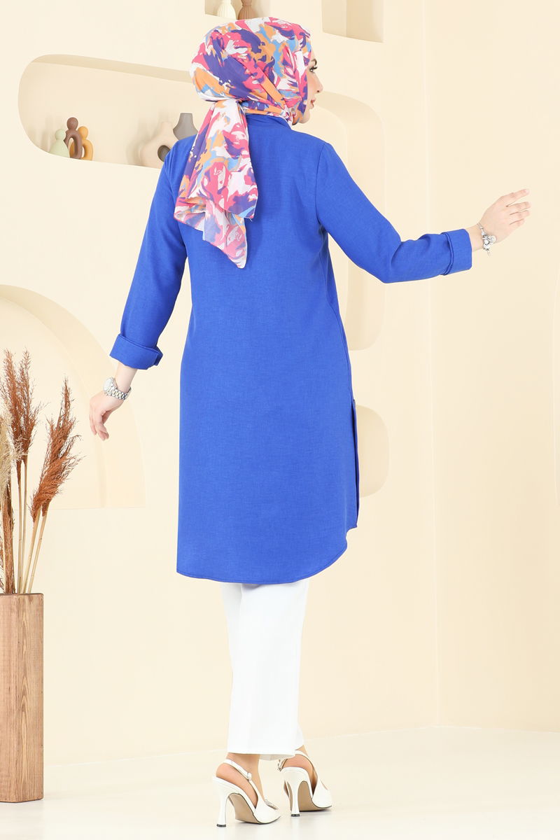 The Slit Buttoned Linen Tunic is an ideal choice for those who prefer modest clothing. This tunic, which can be comfortably worn in all four seasons, can be washed at a gentle 30 degrees. Made from quality linen fabric, this product features a shirt collar and a front button design that stands out. It offers comfortable use with its unlined structure and active cuff buttons. The product worn by the model is a size 38.
