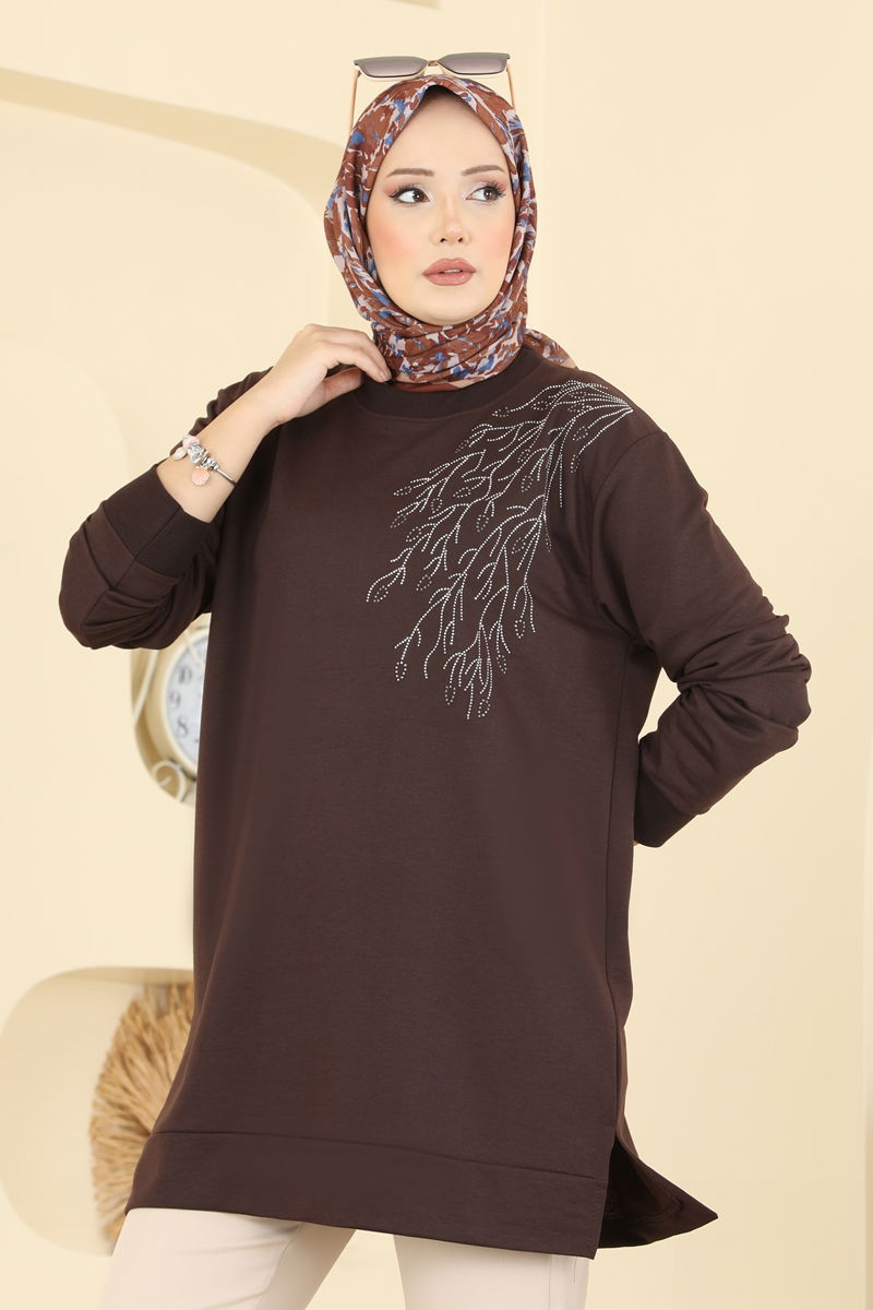 Discover elegance and comfort together with the Leaf Patterned Two String Tunic! This tunic can be comfortably worn in all four seasons and can be cleaned with a gentle wash at 30 degrees. Made from a special two-thread fabric, it is durable and long-lasting. It features a bicycle neckline and side slit details for a modern look. Its lining-free design provides maximum comfort and does not show the inside. Elevate your elegance with stone details!
