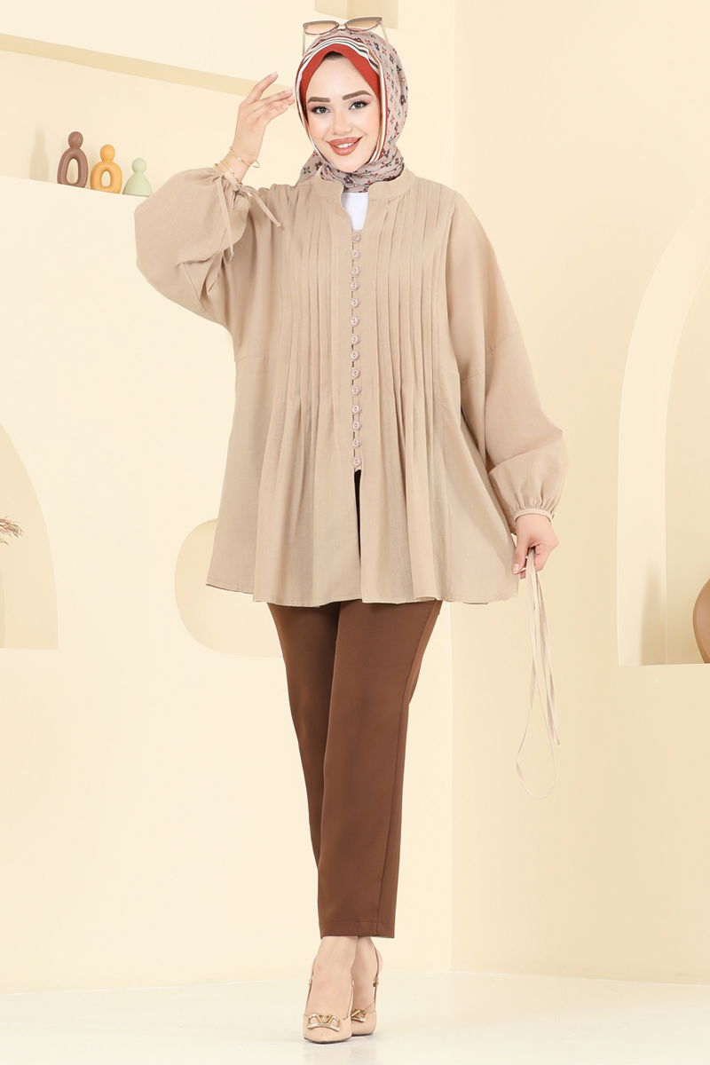 المنتج لديه ياقة نصف بيضوية. المنتج به أزرار من الأمام. غير مبطنة. الحزام متضمن، ،يمكن استخدامها حسب الرغبة مع حزام بأربطة. قد يكون هناك اختلاف في الدرجة اللونية في المنتج بسبب التقاط الصور الفوتوغرافية.
