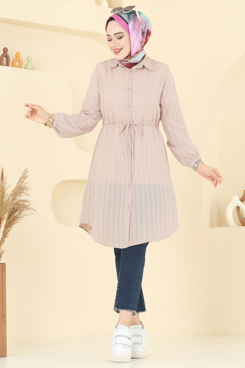 يتميز بخصر ذو أربطة. المنتج لديه ياقة القميص. المنتج به أزرار من الأمام. غير مبطنة. السوار مطاطي. قد يكون هناك اختلاف في الدرجة اللونية في المنتج بسبب التقاط الصور الفوتوغرافية.