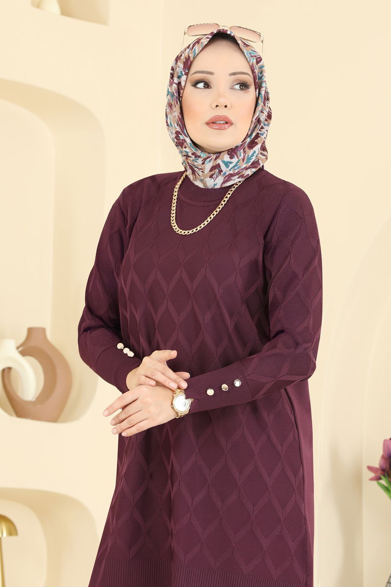 The Baklava Pattern Mercerized Tunic is a stylish tesettür tunic suitable for all seasons. It's designed for delicate washes and can be washed at 30 degrees. Made of mercerized knit fabric, it features a bike neck design and side slits that offer a contemporary look. This unlined tunic is available in a standard size that fits sizes 38-40-42-44. Chic cuff buttons add an elegant touch.