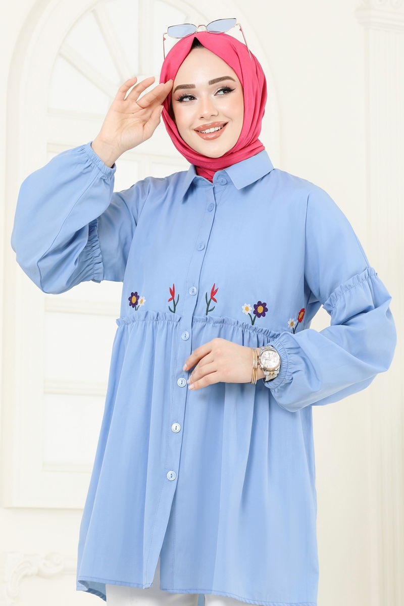 Embroidered Tunic is a stylish modest wear product that can be comfortably used in all seasons. Made from poplin fabric, this tunic offers practical wear with its shirt collar design and button-down front. It can be washed at 30 degrees with delicate care. Its unlined structure and elasticized cuffs enhance comfort. Embellished with embroidery details, this tunic helps you achieve a sophisticated look. (Model wears size 38; Height: 165 cm, Chest: 88 cm, Waist: 68 cm, Hip: 99 cm, Weight: 56 kg.)