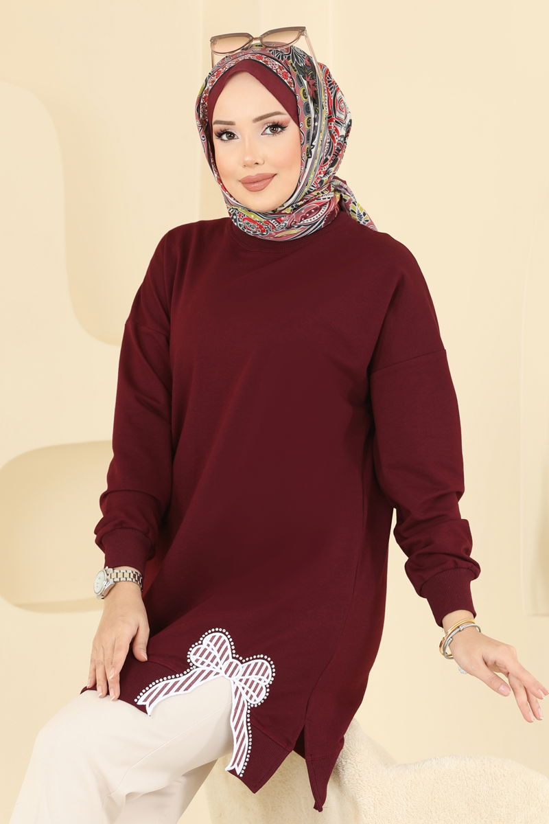 The Ribbon Slit Dual Yarn Tunic is a stylish modest wear that can be comfortably worn across all seasons. Made from dual yarn fabric, this tunic features a bicycle neck design and a front slit detail that captures attention. Its unlined structure offers a light and comfortable fit. It can be washed gently at 30 degrees Celsius. The product on the model is size S-M and is also available in different sizes.
