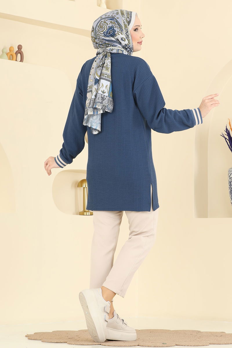 The Ribbed Cuff Detailed Tunic is an ideal modest wear with its unique design and comfortable structure, suitable for all seasons. It can be cleaned with a gentle wash at 30 degrees and features a braided fabric and mandarin collar, making the tunic both stylish and practical. Its side slits offer freedom of movement, and its unlined structure emphasizes lightness. The product displayed on the model is size 38.