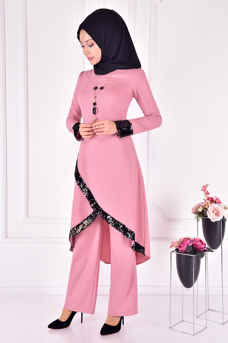 Şifon Detaylı Pantolonlu İkili Takım Mor 02 EFY3838