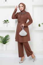 Taş Detaylı Tesettür Takım 282DVL897-M Kahve