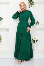 Eteği Fırfırlı Keten Elbise 4719ZNK903-M Zümrüt
