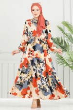 Beli Tünelli Tesettür Elbise 7124BGS895-M Bordo