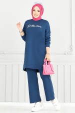 Yazı Baskılı Tesettür Takım 4107PM1063-M İndigo