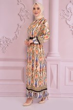 Etnik Desenli Şifon Elbise Krem NEV14896