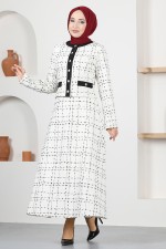 Etnik Desenli Şifon Elbise Krem NEV14896