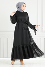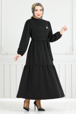 Broşlu Tesettür Elbise 4518NFC915-M Siyah