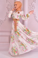 Kuşaklı Şifon Abiye Beyaz NEV24342