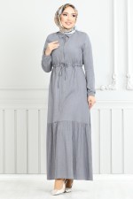 Beli Bağcıklı Tesettür Elbise 779ASE1099-M Gri