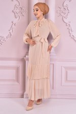 Yaka Bağcıklı Şifon Elbise Bej NEV14715